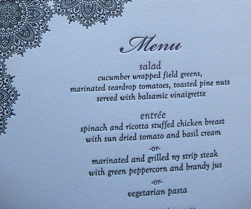 Our services include letterpress printing, foil stamping and embossing. Additionally, we provide die-cutting, duplexing, edge painting, corner rounding, drilling, scoring, folding and Pantone ink matching.