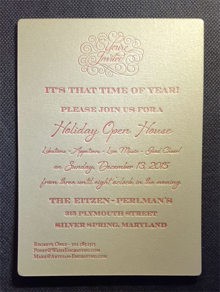 The original printing method was developed by Johannes Gutenberg in 1439 utilizing a re-purposed wine press. Raised movable type was inked and then pressed onto the surface of the paper. Today, we utilize digital artwork and a photo polymer letterpress plate.